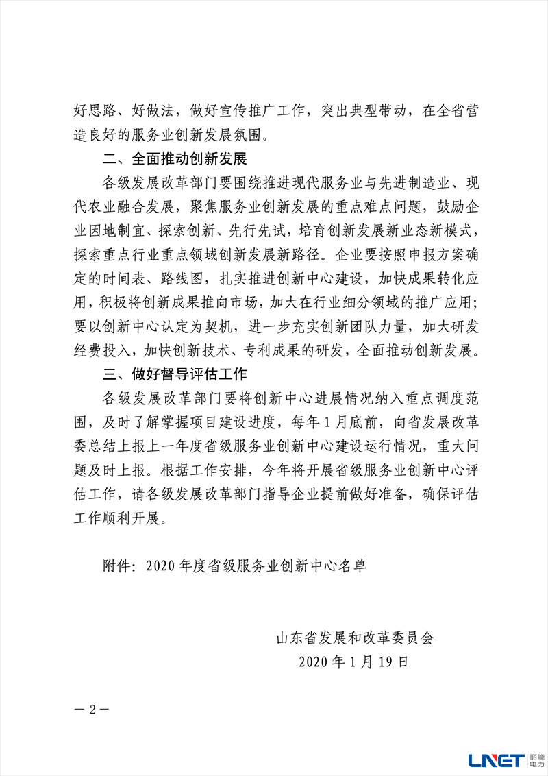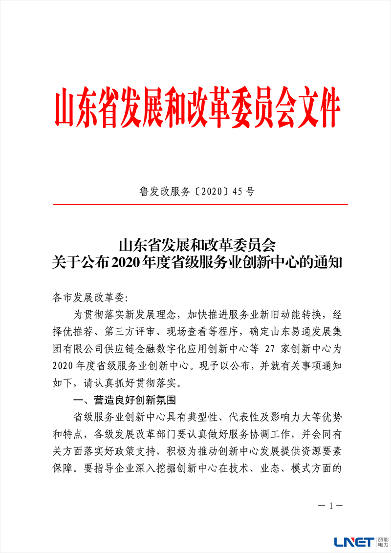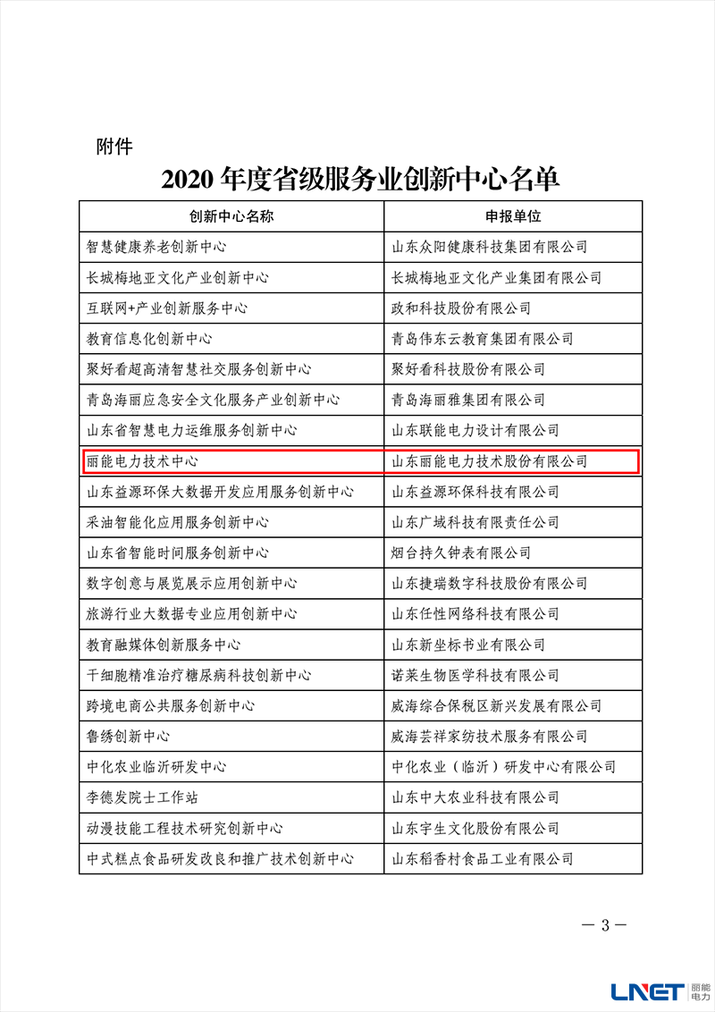 1月19号,丽能电力技术中心被山东省发展和改革委员会认定为“省级服务业创新中心”,此次全省共有 27 家企业获此殊荣。