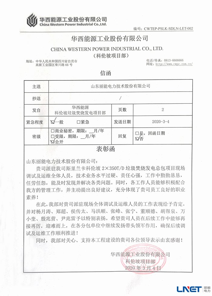 表彰函中对我公司派驻斯里兰卡科伦坡2*350T/D垃圾发电项目现场调试及运维全体人员提出表扬,对他们的工作表现给予了充分肯定。称赞他们技术专业水平过硬、责任心强,工作勤勤恳恳,任劳任怨;能及时发现并解决各类问题;能积极配合管理,并提出良好建议。同时,对我公司调试及运维人员杨月涛、郑超等11人予以特别表扬,并对我公司今后的工作给予厚望,对支持该项目工作的公司领导表示感谢。