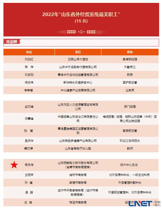 喜讯!丽能电力杨月涛同志荣获“山东省外经贸系统最美职工”荣誉称号
