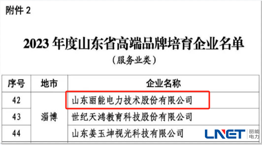 2024年1月26日,山东省市场监督管理局公布2023年度山东省高端品牌培育企业名单,丽能电力位列其中(服务业类)。自2004年公司“走出去”以来,一直践行“为客户多想一点  比客户多走一步”的服务理念,成功打入东南亚、中亚、非洲市场。20年来成功服务了印度尼西亚、柬埔寨、泰国、埃塞俄比亚、吉尔吉斯斯坦、斯里兰卡、菲律宾、肯尼亚等十几个国家的50多家电力企业。