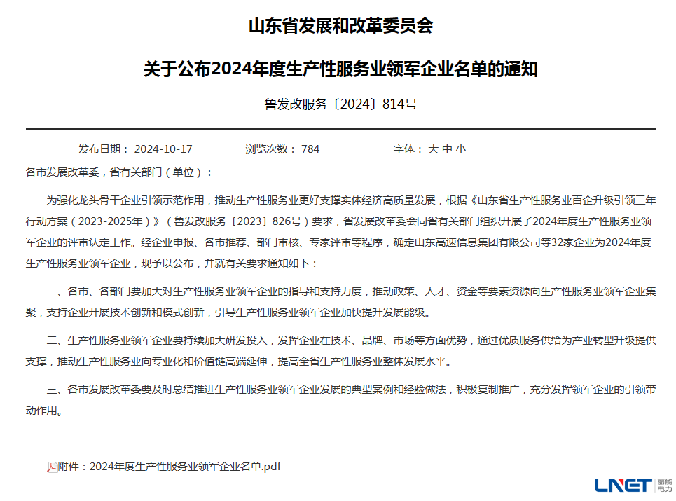 为强化龙头骨干企业引领示范作用,推动生产性服务业更好支撑实体经济高质量发展,山东省发展和改革委员会组织开展了2024年度生产性服务业领军企业评审认定工作。经过严格的专家评审和层层筛选,丽能电力凭借卓越的服务质量、技术创新能力和市场影响力,被评为2024年度山东省生产性服务业领军企业。