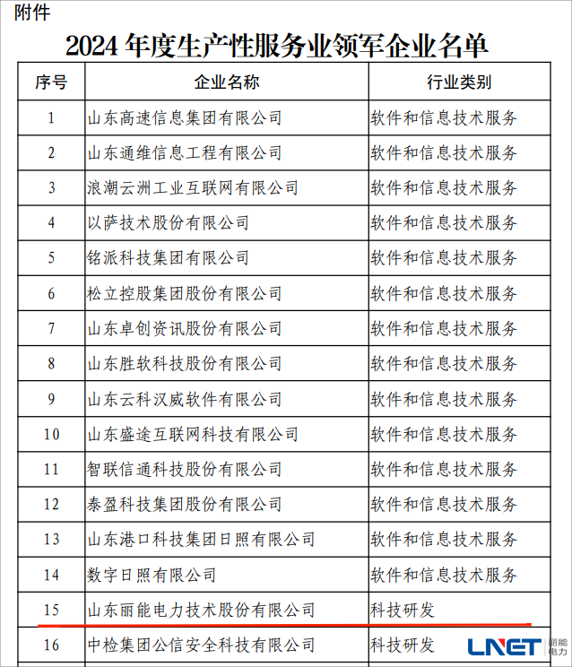 喜讯!丽能电力被评为山东省生产性服务业领军企业