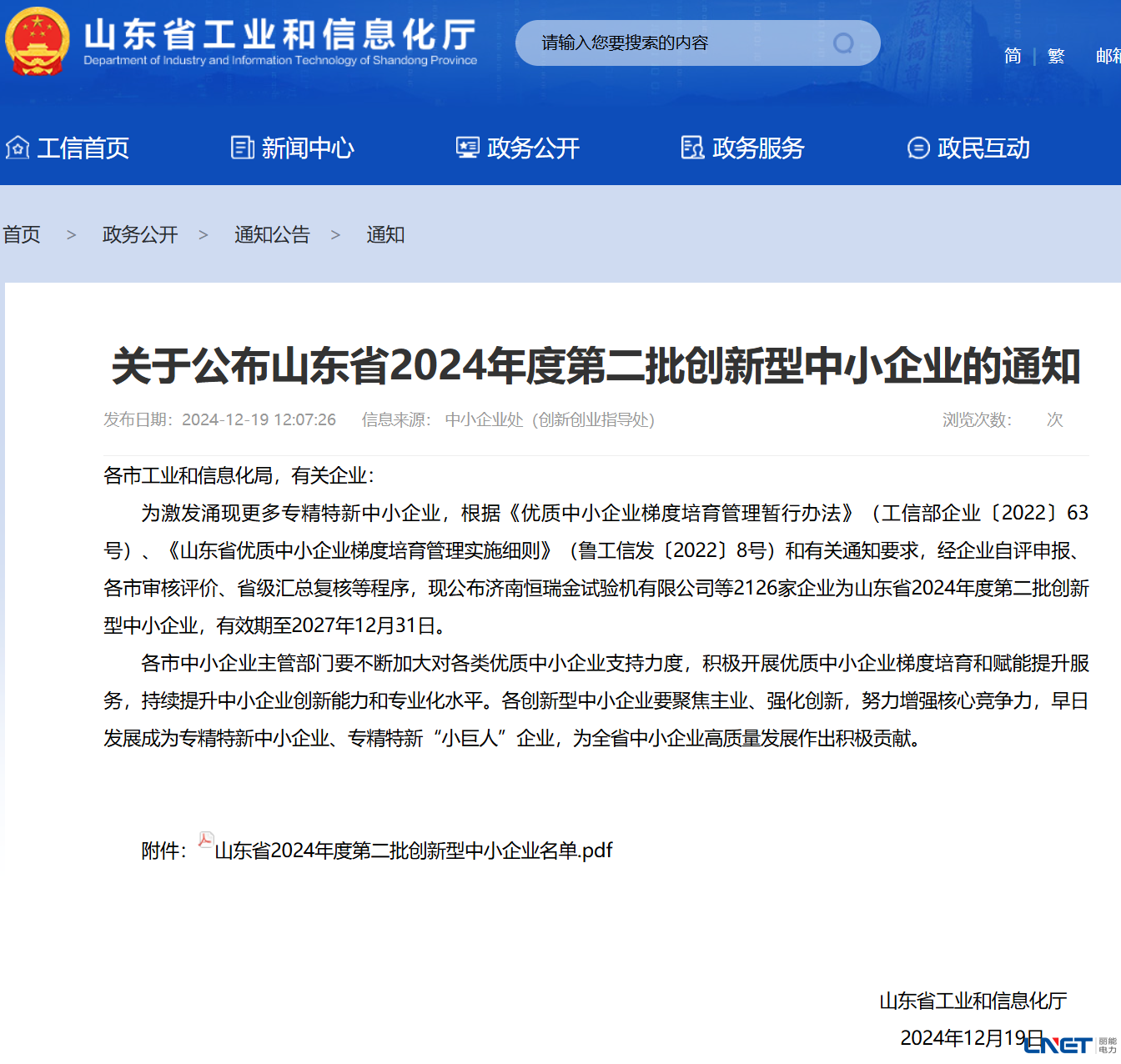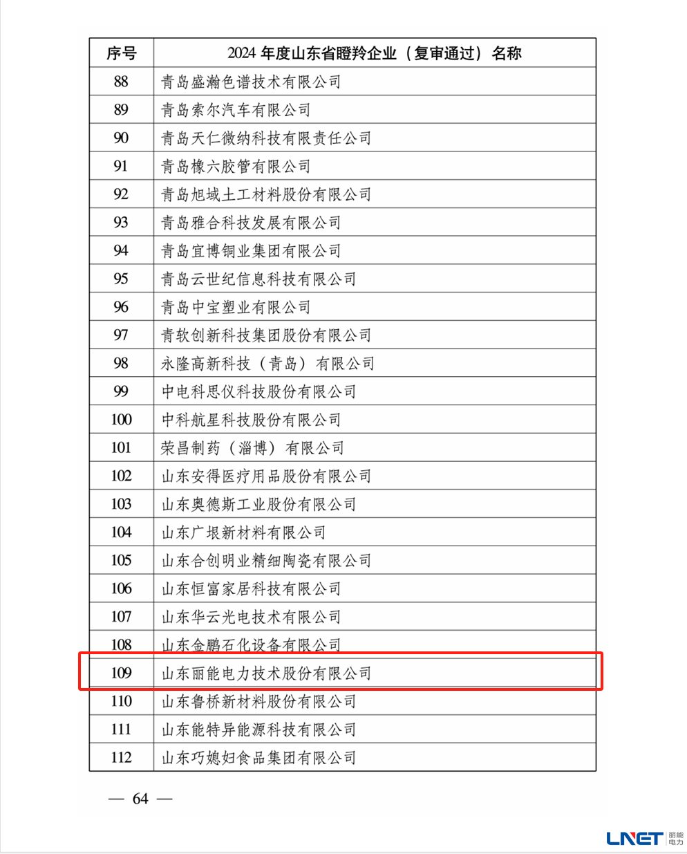 在创新发展的道路上,山东丽能电力技术股份有限公司一路高歌猛进,于2024年12月顺利通过了山东省2024年瞪羚企业复审并荣获山东省2024年度创新型中小企业称号。