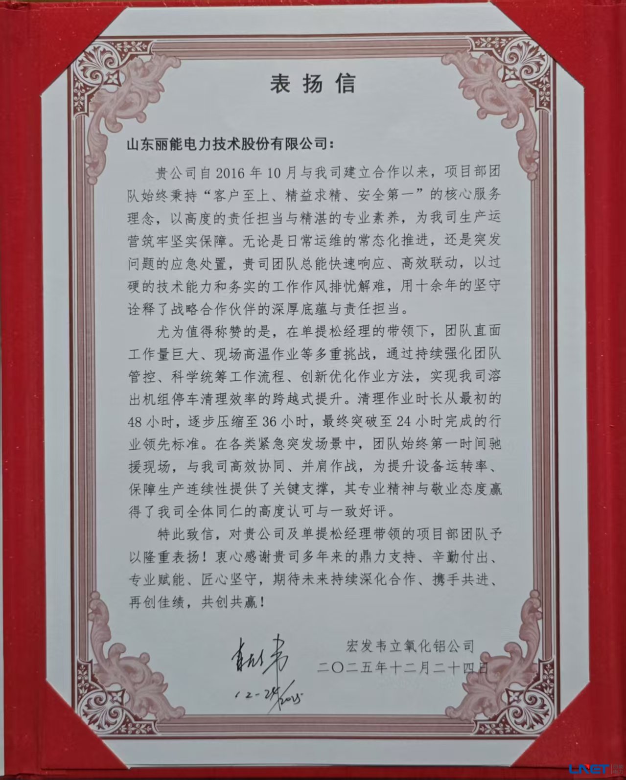 这份认可,源自十余年如一日的专业坚守。自 2016 年与宏发韦立氧化铝公司建立合作以来,丽能电力始终秉持 “为客户多想一点,比客户多走一步” 的服务理念。团队直面高温作业、繁重工作量的挑战,通过优化流程、创新方法,将溶出机组停车清理时长从 48 小时压缩至 24 小时,刷新了行业领先标准。从日常运维到应急处置,从设备抢修到流程优化,他们以精湛技术和务实作风,为合作方生产运营筑牢坚实保障,用十余年的坚守诠释了战略合作伙伴的责任与担当。