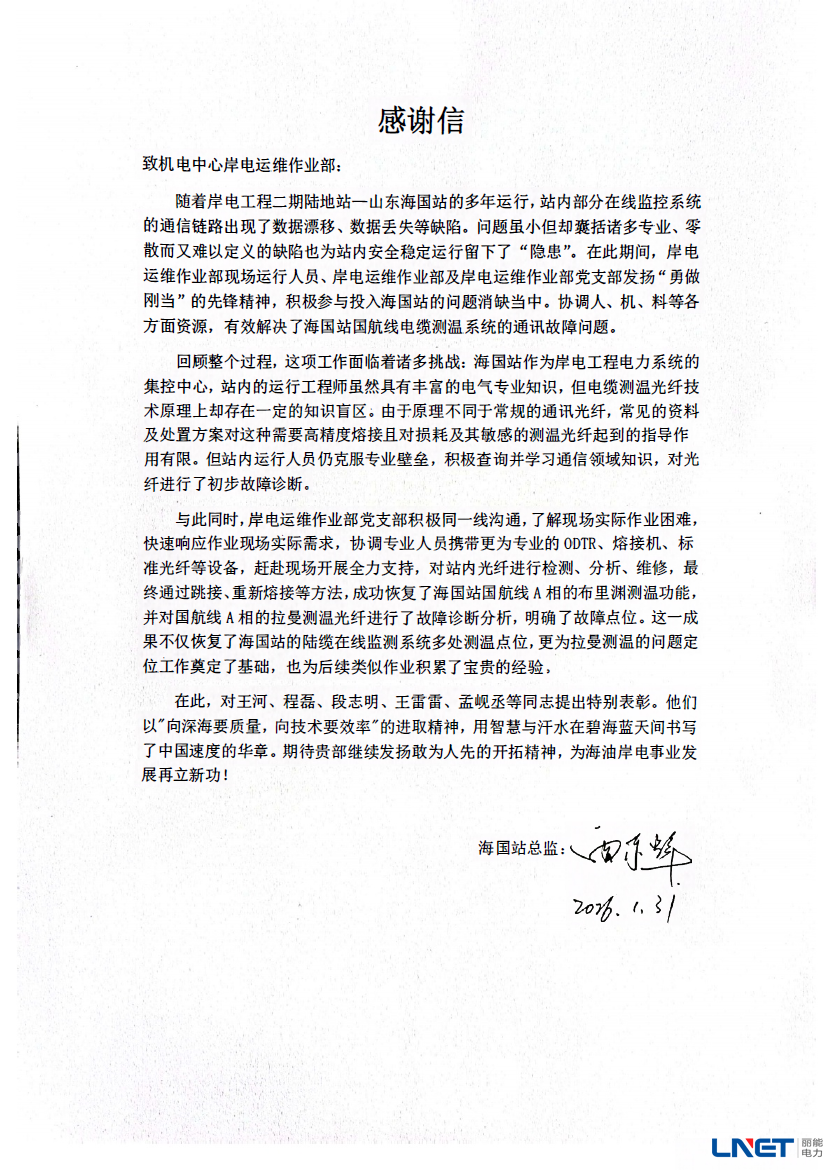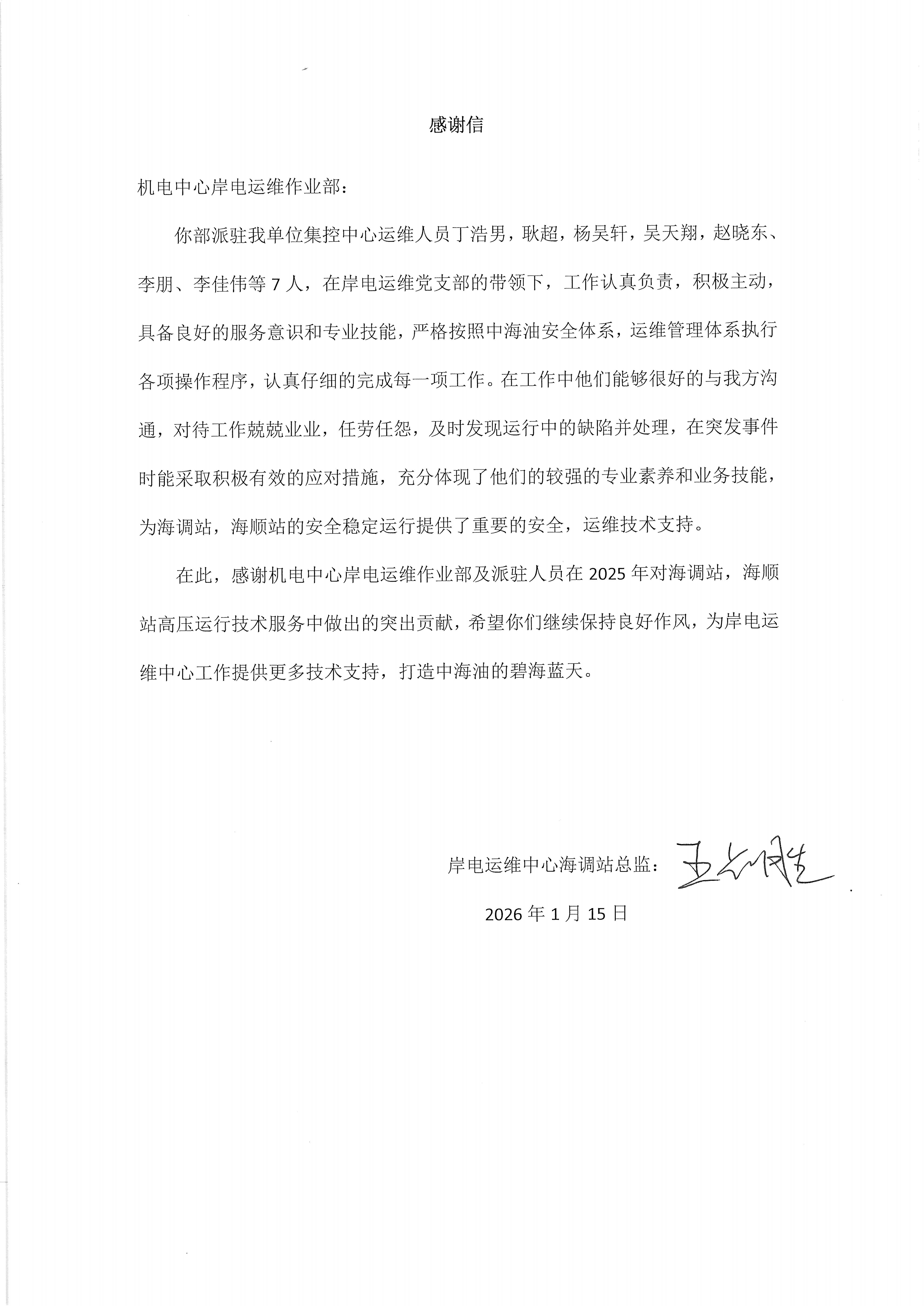 2025-2026 年之交,公司捷报频传,接连斩获合作方多项重磅表彰。从中船(内蒙古)乌拉特新能源有限公司颁发的“协助贡献奖”,到宏发韦立氧化铝公司授予的“2025年度金牌合作优质服务奖”;从中海油秦皇岛32-6油田CEPJ管理中心的感谢信,到岸电运维中心海调站的诚挚肯定,一份份荣誉不仅是对公司专业实力与服务品质的高度认可,更是对未来深化合作、携手共进的美好期许。