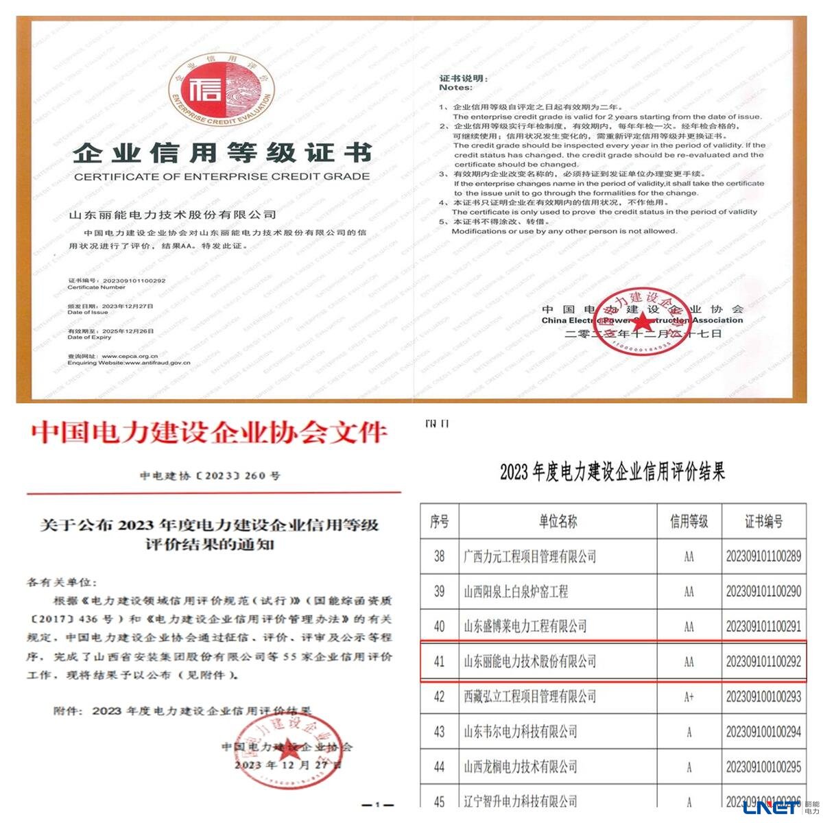 丽能电力于2023年8月份,接受中国电力建设企业协会2023年电力建设企业信用评价工作检查验收,经过了网上填报、专家评审、现场访谈核查等环节,最终公司取得中国电力建设企业协会颁发的企业信用AA等级证书。