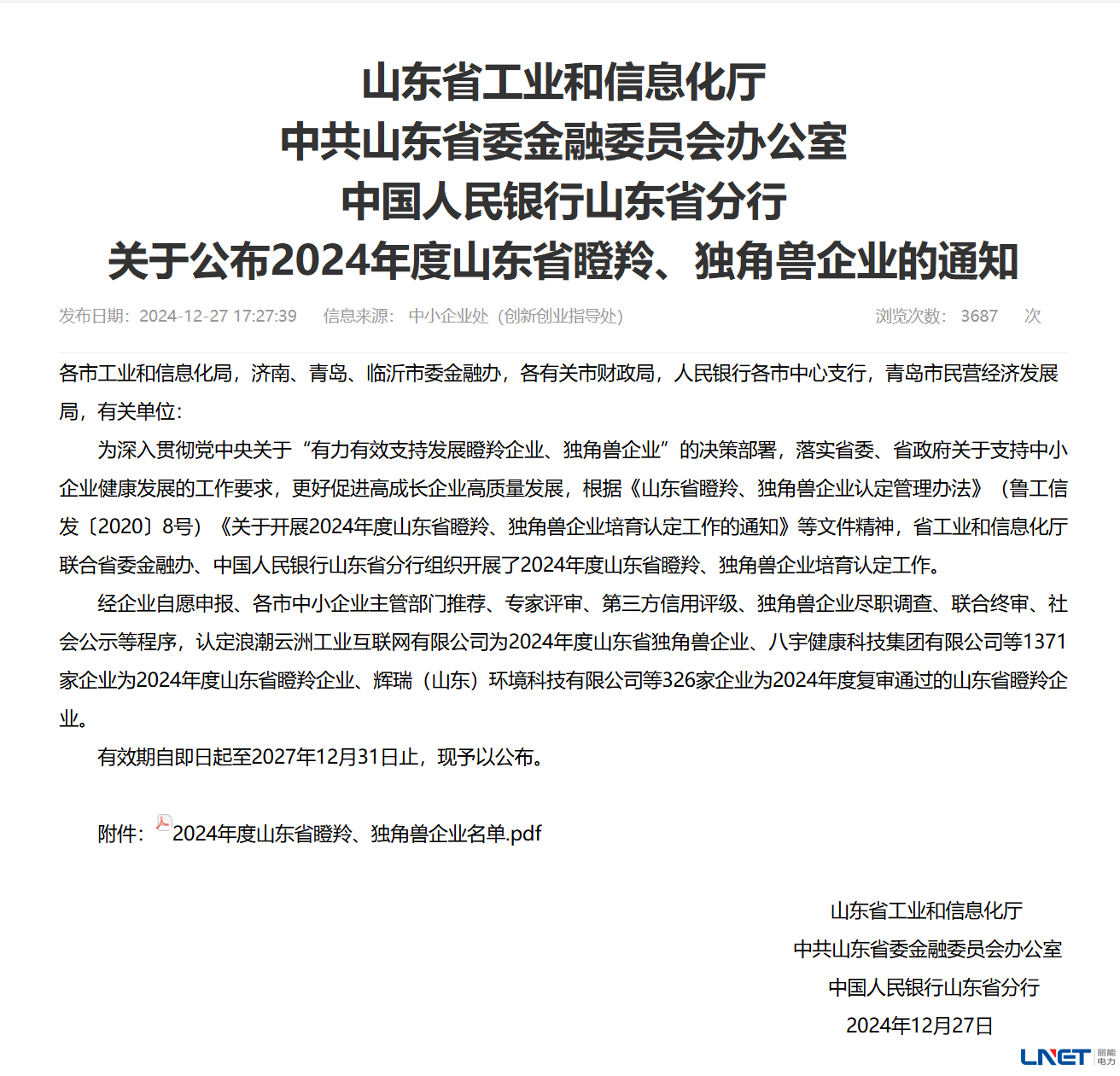 在创新发展的道路上,山东丽能电力技术股份有限公司一路高歌猛进,于2024年12月顺利通过了山东省2024年瞪羚企业复审并荣获山东省2024年度创新型中小企业称号。