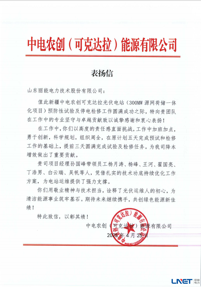 近日,新疆中电农创可克达拉220KV光伏电站(300MW源网荷储一体化项目)预防性试验及停电检修工作圆满收官。山东丽能电力技术股份有限公司凭借专业实力与高效执行,提前三天完成任务,为项目降本增效作出重要贡献,赢得业主方高度认可。