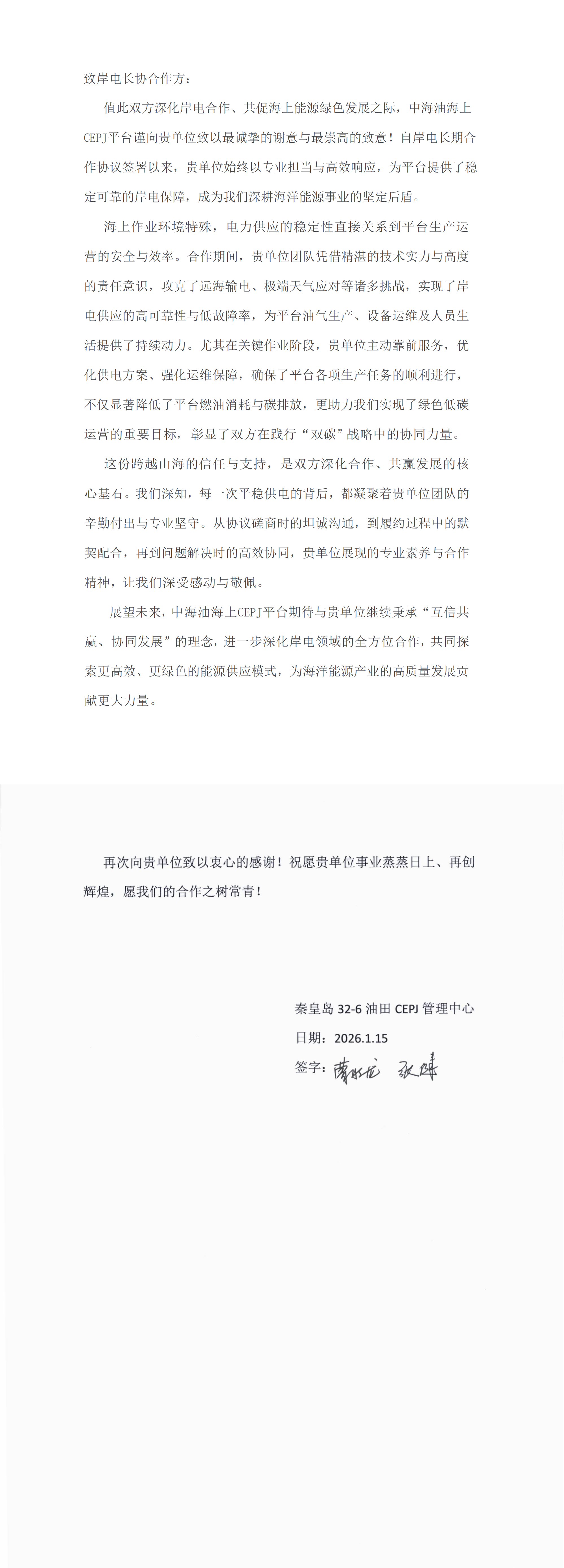 2025-2026 年之交,公司捷报频传,接连斩获合作方多项重磅表彰。从中船(内蒙古)乌拉特新能源有限公司颁发的“协助贡献奖”,到宏发韦立氧化铝公司授予的“2025年度金牌合作优质服务奖”;从中海油秦皇岛32-6油田CEPJ管理中心的感谢信,到岸电运维中心海调站的诚挚肯定,一份份荣誉不仅是对公司专业实力与服务品质的高度认可,更是对未来深化合作、携手共进的美好期许。